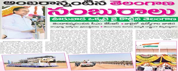 మరోవైపు తెలంగాణ వ్యాప్తంగా రాష్ట్ర అవతరణ వేడుకలు ఘనంగా ప్రాంభమయ్యాయి. రాష్ట్ర వ్యాప్తంగా పలు జిల్లాల్లో మంత్రులుపతకావిష్కరణ చేశారు. గన్పార్క్లోని అమరవీరుల స్తూపం వద్ద తెలంగాణ రాష్ట్ర ముఖ్యమంత్రి కేసీఆర్ నివాళులర్పించారు.కార్యక్రమంలో డీజీపీ అనురాగ్శర్మ, ఎమ్మెల్సీలు కర్నె ప్రభాకర్, నేతి విద్యాసాగర్రావు తదితరులు పాల్గొన్నారు.పరేడ్ మైదానంలో తెలంగాణ రాష్ట్ర అవతరణ వేడుకలు హైదరాబాద్: సికింద్రాబాద్ పరేడ్ మైదానంలో తెలంగాణ రాష్ట్ర అవతరణ వేడుకలు ఘనంగా ప్రారంభమయ్యాయి. తెలంగాణ సీఎం కేసీఆర్ పరేడ్ మైదానంలో పోలీసుల గౌరవ వందనం స్వీకరించారు. కవాతు, శకటాల ప్రదర్శనలు కొనసాగింది. తెలంగాణ రాష్ట్ర వ్యాప్తంగా ఆవిర్భావ వేడుకలు అట్టహాసంగా ప్రారంభమయ్యాయి. ఆయా జిల్లాలో ప్రజాప్రతినిధులు జాతీయ జెండాను ఆవిష్కరించారు. తెలంగాణ ఆవిర్భావ దినోత్సం సందర్భంగా డిప్యూటీ స్పీకర్ పద్మాదేవేందర్రెడ్డి అసెంబ్లీలో జాతీయ జెండాను ఎగురవేయగా, మండలిలో చైర్మన్ స్వామిగౌడ్ జెండా ఆవిష్కరించారు. తెలంగాణ ఆవిర్భావ వేడుకలు జీహెచ్ఎంసీ కార్యాలయంలో ఘనంగా నిర్వహించారు. కమిషనర్ సోమేష్కుమార్, అధికారులు, జీహెచ్ఎంసీ సిబ్బంది పాల్గొన్నారు. సంగారెడ్డి కలెక్టరేట్లో మంత్రి హరీష్రావు తెలంగాణ తల్లి విగ్రహాన్ని ఆవిష్కరించారు. అనంతరం అమరవీరుల స్థూపానికి నివాళులర్పించారు. ఆదిలాబాద్ లో తెలంగాణ ఆవిర్భావ వేడుకలు పోలీసు పరేడ్ గ్రౌండ్లో అట్టహాసంగా ప్రారంభమయ్యాయి. మంత్రి జోగురామన్న అమరవీరుల స్థూపాన్ని ఆవిష్కరించారు. వరంగల్ హన్మకొండ పోలీస్స్టేషన్లో తెలంగాణ ఆవిర్భావ వేడుకలు ఘనంగా జరిగాయి. పోలీసు సిబ్బంది ఈ వేడుకల్లో పాల్గొన్నారు. డిప్యూటీ సిఎం కడియం శ్రీహరి జెండా ఆవిస్కరణ చేసి గౌరవ వందనం స్వీకరించారు. కరీంనగర్ రాష్ట్ర ఆవిర్భావ వేడుకల్లో భాగంగా పెద్దపల్లి ప్రభుత్వ జూనియర్ కాలేజీలో అమరువీరుల స్థూపానికి ఎమ్మెల్యే దాసరి మనోహర్రెడ్డి నివాళులర్పించారు. జిల్లా కేంద్రంలో మంత్రి ఈటెల గౌరవవందనం స్వీకరించారు. గోదావరిఖని బొగ్గు గనుల్లో తెలంగాణ ఆవిర్భావ వేడుకలు ఘనంగా నిర్వహించారు. అమరవీరులకు సింగరేణి కార్మికులు నివాళులర్పించారు. నల్గొండలో తెలంగాణ ఆవిర్భావ దినోత్సవం సందర్భంగా నాగార్జునసాగర్ కొత్తబ్రిడ్జిపై సంబరాలు నిర్వహించారు. పోలీస్పరేడ్ గ్రౌండ్లో నిర్వహించిన ఆవిర్భావ వేడుకల్లో మంత్రి జగదీష్రెడ్డి పాల్గొన్నారు. న్యూఢిల్లీలోని తెలంగాణ భవన్లో రాష్ట్ర అవతరణ సంబురాలు ఘనంగా నిర్వహించారు. తెలంగాణ ఉప ముఖ్యమంత్రి మహమూద్ అలీ ముఖ్యఅతిథిగా పాల్గొని జాతీయ జెండాను ఆవిష్కరించారు.