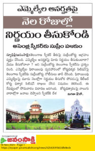 న్యూఢల్లీి(జనంసాక్షి):తెలంగాణ స్పీకర్ తీరుపై సుప్రీంకోర్టు ఆగ్రహం వ్యక్తం చేసింది. ఎమ్మెల్యేల అనర్హతపై విూరు నిర్ణయం తీసుకుంటారా? మేము తీసుకోవాలా ? అని సుప్రీంకోర్టు తెలంగాణ స్పీకర్ను ప్రశ్నించింది. ఎమ్మెల్యేల ఫిరాయింపు వ్యవహారంలో కోర్టుధిక్కర పిటిషన్పై తెలంగాణ స్పీకర్కు సుప్రీంకోర్టు నోటీసులు జారీ చేసింది. ఫిరాయింపు ఎమ్మెల్యేలపై మూడు నెలల్లోగా నిర్ణయం తీసుకోక పోవడంపై కేటీఆర్ కోర్టు ధిక్కార పిటిషన్ దాఖలు చేసిన విషయం తెలిసిందే. ఈ నేపథ్యంలో సోమవారం విచారణ జరిగింది. కోర్టుధిక్కారంపై నాలుగు వారాల్లోగా జవాబు చెప్పాలని స్పీకర్కి దేశ అత్యున్నత న్యాయస్థానం ఆదేశాలు జారీ చేసింది. ఈ పిటిషన్ను సుప్రీంకోర్టు ప్రధాన న్యాయమూర్తి జస్టిస్ బిఆర్. గవాయి ధర్మాసనం విచారణ జరిపింది. మూడు నెలల్లోగా నిర్ణయం తీసుకోకపోవడం కోర్టు ధిక్కారమే.. రోజువారీగా విచారణ జరిపి నిర్ణయం తీసుకోవాలని జస్టిస్ బీఆర్ గవాయి స్పష్టం చేశారు. నాలుగు వారాల్లోగా విచారణ పూర్తి చేస్తామని స్పీకర్ తరఫున న్యాయవాదులు అభిషేక్ సింగ్, ముకుల్ రోహత్గి వెల్లడిరచారు. తెలంగాణలో ఎమ్మెల్యేల అనర్హత పిటిషన్లపై సుప్రీంకోర్టులో సోమవారం విచారణ జరిగింది. ఈ అంశంపై సర్వోన్నత న్యాయస్థానం స్పీకర్కు మరో 4 వారాల గడువు ఇచ్చింది. ఈలోపు నిర్ణయం తీసుకోవాలని సూచించింది. కేసు విచారణను కూడా 4 వారాలకు వాయిదా వేసింది. తెలంగాణలో పదిమంది ఎమ్మెల్యేల అనర్హత అంశానికి సంబంధించి దాఖలైన మూడు వేర్వేరు పిటిషన్లు సోమవారం సుప్రీంకోర్టు ప్రధాన న్యాయమూర్తి జస్టిస్ బీఆర్ గవాయ్ ధర్మాసనం ముందుకు విచారణకు వచ్చాయి. ఆ ఎమ్మెల్యేలకు వ్యతిరేకంగా భారత రాష్ట్ర సమితి దాఖలు చేసిన పిటిషన్లపై మూడునెలల్లోపు నిర్ణయం తీసుకోవాలని జులై 31న జస్టిస్ బీఆర్ గవాయ్ నేతృత్వంలోని ధర్మాసనం ఆదేశించింది. అయితే విభిన్న కారణాలవల్ల ఆలోపు నిర్ణయం తీసుకోవడం సాధ్యం కానందున స్పీకర్కు మరో రెండునెలలు గడువు ఇవ్వాలని కోరుతూ తెలంగాణ శాసనసభ కార్యదర్శి దాఖలు చేసిన మిసిలేనియస్ అప్లికేషన్ సీజేఐ ధర్మాసనం ముందు 14వ నంబరులో లిస్ట్ అయింది. ఈక్రమంలో ఆయా పిటిషన్లపై సోమవారం విచారణ చేపట్టిన న్యాయస్థానం స్పీకర్కు మరో 4 వారాల గడువు ఇచ్చింది.