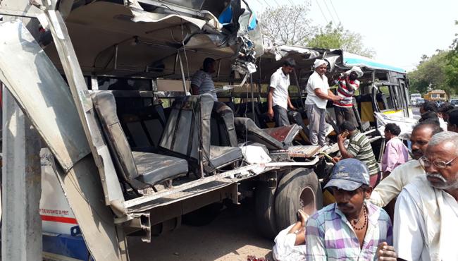 కరీంనగర్,మే29(జనం సాక్షి): అతివేగంగా వచ్చిన లారీ ఆర్టీసీ బస్సున ఢీకొనడంతో ఏడుగురు ప్రయాణికులు దుర్మరణం చెందారు. ఓవర్ టేక్ చేయబోయిన లారీ ఎదురుగా వస్తోన్న బస్సును ఢీకొనడంతో ప్రమాధం జరిగింది. ఈ విషాధ ఘటన మంగళవారం ఉదయం కరీంనగర్ జిల్లా మానకొండూరు మండలం చంజర్ల వద్ద చోటు చేసుకుంది. వరంగల్ నుంచి కరీంనగర్ వైపు 40మంది ప్రయాణికులతో వెళుతున్న ఆర్టీసీ బస్సు చంజర్ల వద్దకు రాగానే కరీంనగర్ నుంచి వరంగల్ వైపు వెళ్తున్న లారీ వేగంగా దూసుకెళ్తుంది. ఈ సమయంలో ముందున్న లారీని వెనుకాలున్న లారీ ఓవర్టేక్ చేసుకుంటూ రావడంతో లారీ ఒక్కసారిగా అదుపుతప్పి బస్సును ఢీకొట్టంది. ఈ ఘటనతో బస్సులో ప్రయాణిస్తున్న ఆరుగురు ప్రయాణీకులు అక్కడికక్కడే మృతి చెందగా చికిత్స పొందుతూ మరో వ్యక్తి మృతి చెందాడు. బస్సు ఢీకొన్న లారీ వెనుకాలే వస్తున్న రెండు ద్విచక్ర వాహనాలను సైతం ఢీకొనడంతో వాహనాల్లో ప్రయాణిస్తున్న వారికి తీవ్ర గాయాలయ్యాయి. ఘటన విషయాన్ని తెలుసుకున్న స్థానికులు, పోలీసులు అక్కడికి చేరుకొని క్షతగాత్రులను స్థానిక ప్రభుత్వ, ప్రైవేట్ ఆసుపత్రులకు తరలించారు. బస్సులో ప్రయాణిస్తున్న 30మందికిపైగా గాయాలయ్యాయి. వీరిలో ఐదుగురికి పరిస్థితి విషమంగా ఉన్నట్లు వైద్యులు పేర్కొన్నారు. పలువురిని మెరుగైన వైద్యం నిమిత్తం విజయవాడ ఆసుపత్రికి తరలించినట్లు వైద్యులు పేర్కొన్నారు. బస్సు వెనుక భాగంలో లారీ బలంగా ఢీకొనడంతో సగం బస్సు తునాతునకలైంది. ఆ సీట్లలో కూర్చున్న ప్రయాణికుల్లో ఏడుగురు మృతిచెందారు. ప్రమాద ప్రాంతంలో మృతుల శరీర భాగాలు, రక్తంతో భయానక పరిస్థితి నెలకొంది. లారీ అతివేగంతో రావడం, రహదారి మధ్యలో డివైడర్ లేకపోవడమే ఈ ప్రమాదానికి కారణమని పోలీసులు చెబుతున్నారు. ఇదిలా ఉంటే మృతుల బంధువుల రోధనలతో ఘటన స్థలం మారుమోగింది. అప్పటి వరకు తమతో ఉండి అనుకోని ప్రమాదంతో మృతిచెందడంతో మృతుల కుటుంబ సభ్యులు గుండెలు అవిసేలా రోధిస్తున్నారు. మరోవైపు క్షతగాత్రుల బంధువుల రోధనలతో ఆసుపత్రి ప్రాంగణం మారుమోగిపోయింది. కాగా మృతదేహాలను పోస్టుమార్టం నిమిత్తం మార్చరీకి తరలించిన పోలీసులు కేసు నమోదు చేసి దర్యాప్తు చేస్తున్నారు. ఇదిలా ఉంటే ప్రమాదంలో మృతిచెందిన ఐదుగురి వివరాలను పోలీసులు వెల్లడించారు. పిల్లి లక్ష్మీ (60)- మానకొండూర్ మండలం ముంజంపల్లి