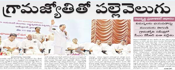 ప్రకటించాలని సూచించారు. గ్రామజ్యోతిలో పంచాయతీరాజ్ వ్యవస్థ మొత్తం పాల్గొనాలని ఆదేశించారు. గ్రామసభలో గ్రామస్తులే గ్రామ ప్రాధాన్యతను గుర్తించాలని చెప్పారు. మనకు శక్తివంతమైన మహిళా సంఘాలున్నాయి. అందరి సమిష్టి కృషితో తెలంగాణను అద్భుతంగా తయారు చేయొచ్చు అని తెలిపారు.గ్రామాలు బాగుంటేనే రాష్ట్రం అభివృద్ధి చెందుతుందని సీఎం కేసీఆర్ పేర్కొన్నారు. గ్రామాల్లో వెలుతురు వచ్చేలా గ్రామజ్యోతిని వెలిగిద్దామని చెప్పారు. అన్ని గ్రామాలకు సంబంధించి నాలుగేళ్ల అభివృద్ధి ప్రణాళికలను రూపొందించాలని సూచించారు. గ్రామాల్లో ప్రణాళికాబద్దంగా అభివృద్ధి పనులు జరగడం లేదన్నారు. ఆ క్రమంలో గ్రామంలోని సమస్యలను గుర్తించాలన్నారు. అతీత శక్తులను పట్టించుకోకుండా ముందుకుపోవాలని సూచించారు. మండలానికి ఒక ఊరిని ఎమ్మెల్యే దత్తత తీసుకోవాలన్నారు. తాను కూడా అన్ని జిల్లాల్లో తిరిగి ప్రజలతో మమేకవుతామని తెలిపారు. విమర్శలకు వెరిస్తే ముందుకు సాగలేదమన్నారు. రాజకీయాలలో తాను పడినన్ని కష్టాలు మరెవరు పడి ఉండరని కెసిఆర్ అన్నారు. ప్రత్యేకించి తెలంగాణ ఉద్యమం ఆరంభించిన 2001 నుంచి ఎన్ని అవాంతరాలు, అపవాదులు,ఎన్ని గందరగోళాలు జరిగాయో తెలుసని, అయినా ఒక స్థిరమైన నిర్ణయం , ఆలోచన ద్వారా లక్ష్య సాధనలో ముందుకు సాగామని ఆయన అన్నారు. అలాగే తెలంగాణలో ఏ అభివృద్ది అయినా ప్రణాళికబద్దంగా సాగాలని తాను కోరుకుంటున్నానని అన్నారు.అన్ని రకాల నిధులు కలిసి గ్రామాలలో పాతికవేల కోట్ల వరకు ఖర్చు చేసే అవకాశం ఉందని కెసిఆర్ చెప్పారు.గ్రామంలో ఉండవలసిన అవసరాలపై పంచాయతీలు ప్లాన్ చేసుకోవలసిన అవసరం ఉందని ముఖ్యమంత్రి కెసిఆర్ అన్నారు. సమావేశంలో రాష్ట్ర మంత్రులు కేటీఆర్, ఈటల రాజేందర్, హరీశ్రావు, జోగు రామన్న, తుమ్మల నాగేశ్వరరావు, సిఎస్ రాజీవ్ శర్మ తదితరులు పాల్గొన్నారు.