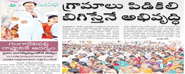 గ్రామాలు పిడికిలి బిగిస్తేనే రాష్ట్ర అభివృద్ధి సాధ్యమని ప్రతి గ్రామ ప్రజలు స్వచ్చందంగా ముందుకు రావాలని, గ్రామజ్యోతికి గంగదేవిపల్లి ఆదర్శమని, ఎవరి గ్రామాన్ని వారు అభివృద్ది చేసుకుంటే బంగారు తెలంగాణ సాధ్యమని సిఎం కెసిఆర్ అన్నారు. స్వయం సమృద్ది సాధించిన గంగదేవిపల్లి మరింతగా పురోగమించడానికి తక్షణంగా పదికోట్లను మంజూరు చేస్తున్నట్లు ప్రకటించారు. తెలంగాణ ప్రభుత్వం ప్రతిష్ఠాత్మకంగా చేపట్టిన ‘గ్రామజ్యోతి’ కార్యక్రమాన్ని వరంగల్ జిల్లా గీసుకొండ మండలం గంగదేవిపల్లి గ్రామంలో ముఖ్యమంత్రి కె.చంద్రశేఖర్రావు ప్రారంభించారు. గంగదేవిపల్లి అభివృద్దికి సంబంధించిన ప్రణాళికను వారే తయారు చేసుకుని తాను మంజూరుచేసిన నిధులను వినియోగించుకోవాలన్నారు. ఇక్కడ రెసిడెన్షియల్ పాఠశాలను కూడా మంజూరు చేస్తున్నట్లు సిఎం ప్రకటించారు. అయితే మరింతగా అభివృద్ది చెందేలా ప్రణాళికుల తయారు చేసుకోవాలని, నిజామాబాద్ జిల్లా అంకాపూర్ను సందర్శించి వ్యవసాయ మెళకువలు తెలుసుకోవాలన్నారు. అలాగే హదారాబాద్ శివారులోని ప్రతగి రిసార్టును సందర్శించి దోమల నివారణకు వారుపెంచుతున్న మొక్కలను తెలుసుకోవాలన్నారు. గ్రామజ్యోతి పథకాన్ని ప్రారంభించేందుకు గాను గంగదేవిపల్లికి చేరుకున్న సీఎం కల్వకుంట్ల చంద్రశేఖర్రావుకు గ్రామంలో ఆయనకు గ్రామస్థులు ఘన స్వాగతం పలికారు. గ్రామ పంచాయతీ భవనాన్ని సందర్శించారు. గ్రామ పంచాయతీ రికార్డులను పరిశీలించారు. సర్పంచ్ను, వార్డు మెంబర్లను అడిగి వివరాలు తెలుసుకున్నారు. గంగదేవిపల్లిలో ఆయన గ్రామస్థుల కరతాల ధ్వనుల మధ్య గ్రామజ్యోతి పథకాన్ని జ్యోతి ప్రజల్వన చేసి ప్రారంభించారు.ఈ గ్రామ పురోభివృద్దిని తెలుసుకునే ఇక్కడ కార్యక్రమాన్ని ప్రారంభించాలని నిర్ణయించామన్నారు. పట్టుబట్టి సాధిస్తే ఏదీ సాధ్యం కాదని తెలంగాణ విషయంలో రుజువు చేసుకున్నామని అన్నారు. మన బతుకులను మనం బాగు చేసుకుందామని తెలంగాణ రాష్ట్రాన్ని సాధించుకున్నామని అన్నారు. పట్టుబడితే గ్రామాలు కూడా బాగుపడతాయన్నారు. వ్యక్తులుగా మనం పటిస్టంగా ఉన్నా సంఘటితంగా పనులు చేయలేకపోతున్నామని అన్నారు. సంఘటిత శక్తిని చాటితే గ్రామాల్లో దరిద్రం పారిపోతుందన్నారు. కష్టపడి తెచ్చుకున్న తెలంగాణను బాగు చేసుకుందామని అన్నారు. గంగదేవిపల్లి ఆదర్శ గ్రామాలకు చక్కటి ఉదాహరణ అని తెలిపారు. ఈ ఊరి ప్రజలు కొన్ని నియమాలు పెట్టుకుని వాటికి కట్టుబడి ఉన్నారని అన్నారు. పరిశుభ్రంగా ఉండటం, పద్ధతిగా జీవించడం చాలా గొప్ప విషయమన్నారు. గంగదేవిపల్లి ప్రజలకు స్ఫూర్తికి శిరస్సు వంచి నమస్కరిస్తున్నానని అన్నారు. ఈ ఊరి ప్రజలే తనను ఇక్కడకు రప్పించాయని తెలిపారు.విూ ఊరికి అవార్డులు కూడా వచ్చాయని గుర