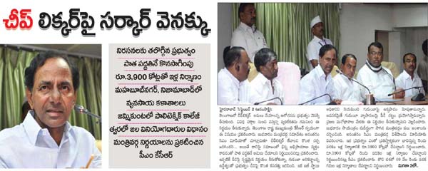 తెలంగాణలో చీప్లిక్కర్ అమలు చేయాలన్న ఆలోచనను ప్రభుత్వం వెనక్కి తీసుకుంది. వివిధ వర్గాల నుంచి వస్తున్న వ్యతిరేకతను గమనించి ఈ నిర్ణయం తీసుకున్నారు. తెలంగాణ రాష్ట్ర ముఖ్యమంత్రి కేసీఆర్ స్వయంగా ఈ విషయం ప్రకటించారు. బుధవారం మంత్రివర్గ సమావేశం అనంతరం సిఎం విూడియాతో మాట్లాడుతూ చీప్లిక్కర్ తేవాలని కొంత చర్చ జరిగిందని… అయితే దానిపై సమాజంలో భిన్న అభిప్రాయాలు వ్యక్తం కావడంతో పాత పద్ధతినే అమలు చేయాలని నిర్ణయించినట్లు ప్రకటించారు. ఇప్పటికే దీనిపై స్పష్టమైన నిర్ణయం తీసుకోకున్నా, గుడంబా అరికట్టాలన్న ఉద్దేశ్యంతో ప్రభుత్వం దీనిపై కొంత కసరత్తు జరిపింది. ఇక ఐజీ స్థాయి అధికారిని నియమించి గుడుంబాపై ఉక్కపాదం మోపుతామన్నారు. అవసరమైతే గుడుంబా వ్యాపారులపై పీడీ చట్టం ప్రయోగిస్తామన్నారు. ప్రజల మనోభావాల మేరకు ఈ నిర్ణయం తీసుకున్నామని వెల్లడించారు. బుధవారం సాయంత్రం సుదీర్ఘంగా సాగిన మంత్రివర్గం పలు అంశాలను చర్చించింది. అనంతరం సిఎం మంత్రివర్గ విశేషాలను విూడియాకు వివరించారు. ఇక ప్రభుత్వం ఎంతో ప్రతిస్టాత్మకంగా భావిస్తున్న రెండు పడకల ఇళ్ల నిర్మాణానికి రూ.3900 కోట్లతో చేపట్టాలని నిర్ణయించారు. రూ.3900 కోట్లతో రెండు పడకల ఇళ్ల నిర్మాణం చేపట్టాలని నిర్ణయించినట్లు సీఎం ప్రకటించారు. తొలి దశలో 60 వేల రెండు పడక గదుల ఇళ్ల నిర్మాణాలు చేపట్టాలని నిర్ణయించారు. ఇందులో భాగంగా నియోజకవర్గానికి 4వేల ఇళ్ల చొప్పున కేటాయించనున్నారు. తెలంగాణలో కొత్త జిల్లాల ఏర్పాటుపై సీఎస్ రాజీవ్శర్మ అధ్యక్షతన కమిటీ ఏర్పాటు చేయాలని నిర్ణయించారు. వ్యవసాయ మార్కెట్ కమిటీల్లో రిజర్వేషన్లు అమలు చేయాలని నిర్ణయించినట్లు వెల్లడించారు. కొత్త జిల్లాల ఏర్పాటుపై అధ్యయనం చేసి నివేదిక ఇచ్చేందుకు సీఎస్ రాజీవ్ శర్మ అధ్యక్షతన కమిటీ ఏర్పాటు చేశామని… నివేదిక ఇచ్చిన తర్వాత నిర్ణయం తీసుకుంటామని చెప్పారు. హైదరాబాద్లో రూ.2631 కోట్లతో బహుళస్థాయి ప్లై ఓవర్లు నిర్మిస్తామని చెప్పారు. పెరిగిన ట్రాఫిక్ దృష్ట్యా ఈ నిర్ణయం తీసుకున్నారు.