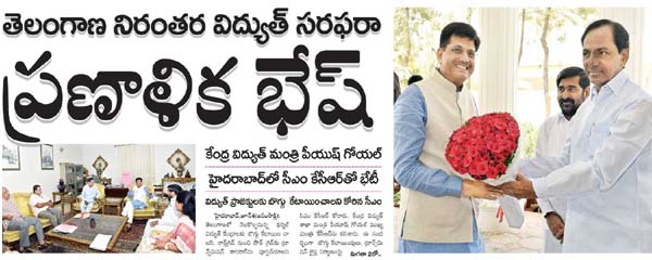 తెలంగాణ రాష్ట్రం ఏర్పడిన ఏడాదికే కోతలు లేని విద్యుత్ సరఫరాపై కేంద్రమంత్రి పీయూష్ గోయల్ ప్రభుత్వాన్ని ప్రశంసించారు. సీఎం కేసీఆర్తో గోయల్ సమావేశమై పలు అంశాలపై చర్చించారు. రాష్ట్ర సౌర విద్యుత్ విధానం బాగుందని గోయల్ ప్రశంసించారు. 2,500 మెగావాట్ల సౌర విద్యుత్ ఉత్పత్తికి సిద్ధం కావడాన్ని అభినందించారు. ఒకే ఏడాది 2,500 మెగావాట్ల సౌర విద్యుత్కు సిద్ధం కావడం ఏ రాష్ట్రంలో లేదని గోయల్ స్పష్టం చేశారు. బొగ్గు కేటాయింపు, ట్రాన్స్మిషన్ లైన్ల నిర్మాణంపై గోయల్కు సీఎం లేఖలు రాశారు. చత్తీస్గఢ్తో మరో వెయ్యి మెగావాట్ల ఒప్పందం చేసుకుంటామని గోయల్కు సీఎం చెప్పారు. ట్రాన్స్మిషన్ల లైన్ల నిర్మాణం త్వరగా పూర్తయ్యేలా చూడాలని సీఎం కోరారు. ఈ భేటీలో విద్యుత్ శాఖ రాష్ట్రమంత్రి జగదీశ్వర్ రెడ్డి, ఎంపి కవిత పాల్గొన్నారు.