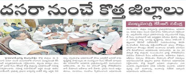 హైదరాబాద్,ఆగస్టు 9(జనంసాక్షి): కొత్త జిల్లాలు ఈ ఏడాది దసరా నుంచే మనుగడలోకి రావాలని ముఖ్యమంత్రి కేసీఆర్ ఉన్నతాధికారులకు నిర్దేశించారు. క్యాంపు కార్యాలయంలో ఇవాళ సీఎం కేసీఆర్ కొత్త జిల్లాలపై అధికారులతో సవిూక్ష నిర్వహించారు. సవిూక్ష సమావేశంలో ఆర్థిక మంత్రి ఈటెల రాజేందర్, ప్రభుత్వ ప్రధాన కార్యదర్శి రాజీవ్ శర్మ, ఆర్థిక, రెవెన్యూ, న్యాయశాఖ అధికారులతో పాటు అడ్వకేట్ జనరల్ రామకృష్ణారెడ్డి పాల్గొన్నారు.ఈ సందర్భంగా సీఎం కేసీఆర్ మాట్లాడుతూ దసరాలోగా అధికారిక ప్రక్రియలన్నింటినీ ముగించాలని ఆదేశించారు. ఈ నెల 3వ వారంలో డ్రాప్ట్ నోటిఫికేషన్ను జారీ చేయాలని ఆదేశాలు జారీ చేశారు. ప్రజల నుంచి అభ్యంతరాలు, సూచనలు, సలహాలు స్వీకరించాలని అధికారులకు సూచించారు. జిల్లాల ఏర్పాటుపై ప్రజాప్రతినిధులు, అధికారులు, వివిధ వర్గాల నుంచి సమాచారం సేకరించాలని నిర్దేశించారు. ఇప్పటివరకు వచ్చిన ప్రతిపాదనలపై చర్చించడానికి డిప్యూటీ సీఎం మహమూద్ అలీ అధ్యక్షతన కడియం శ్రీహరి, తుమ్మల నాగేశ్వర్ రావు, జూపల్లి కృష్ణారావు, ఈటల రాజేందర్ సభ్యులుగా కేబినెట్ సబ్కమిటీని నియమించినట్లు తెలిపారు.రాజకీయ డిమాండ్లు పట్టించుకోకుండా ప్రజల సౌకర్యం, పరిపాలనా సౌలభ్యం తదితర అంశాలను మాత్రమే పరిగణనలోకి తీసుకోవాలని అధికారులకు సూచించారు. ఈ నెల 20 తర్వాత కొత్త జిల్లాలకు సంబంధించిన డ్రాఫ్ట్ నోటిఫికేషన్ను విడుదల చేయాలని సీఎం ఆదేశించారు. అధికారుల విభజన, ఆఫీసుల ఏర్పాటు వేగవంతం చేయాలని..జోనల్ సమస్యలు అధిగమించడానికి వ్యూహం ఖరారు చేయాలని అధికారులకు నిర్దేశించారు. కొత్త జిల్లాలో అధికార యత్రాంగం ఎలా ఉండాలి..న్యాయాధికార పరిధి ఏమేరకు ఉండాలి, అధికార వ్యవస్థ ఎలా ఉండాలన్న అంశాలపై నివేదిక ఇవ్వాలని అధికారులను ఆదేశించారు.