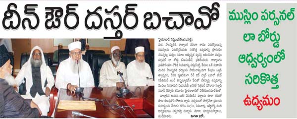 మత, సాంస్కృతిక, రాజ్యాంగ పరంగా తాము ఎదుర్కొంటున్న సమస్యలను ఎదుర్కొనేందుకు సరికొత్త ఉద్యమాన్ని ప్రారంభించనున్నట్లు ముస్లిం సమాజ అత్యున్నత వ్యవస్థ ఆలిండియా ముస్లిం పర్సనల్ లా బోర్డు (ఏఐఎంపీబీ) ప్రకటించింది. రాజ్యాంగం ప్రతిపాదించిన లౌకిక నియమాన్ని పక్కనపెట్టి, కేవలం ఒకే మతానికి చెందిన సాంస్కృతిక ధర్మాలను పాటించాల్సిందిగా కేంద్రం ఒత్తిడి తెస్తున్నదని, దీనికి వ్యతిరేకంగా దీన్ ఔర్ దస్తర్ బచావో (సేవ్ రిలీజియన్ అండ్ కాన్స్టిట్యూషన్) పేరుతో దేశవ్యాప్త ఉద్యమాన్ని మొదలు పెడతామని ఏఐఎంపీబీ జనరల్ సెక్రటరీ మౌలానా సజ్జాద్ నమానీ చెప్పారు శనివారం హైదరాబాద్లో విలేకరుల సమావేశంలో మాట్లాడిన ఆయన.. ఇతర వెనకబడిన వర్గాలను