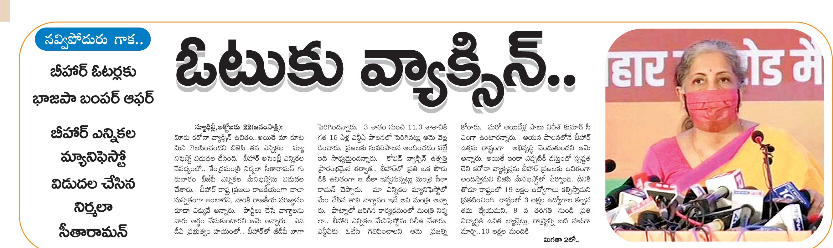– బీహార్ ఎన్నికల మ్యానిఫెస్టో విడుదల చేసిన నిర్మలా సీతారామన్