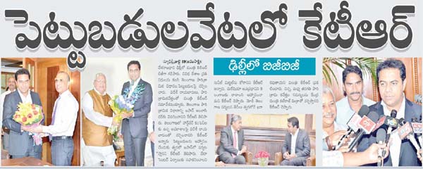 న్యూఢిల్లీ,జులై 19(జనంసాక్షి): దేశరాజధాని ఢిల్లీలో మంత్రి కెటిఆర్ బిజీగా గడిపారు. వివిధ దేశాల ప్రతినిధులను కలసి తెలంగాణ పారిశ్రామిక విధానం,పెట్టుబడులపై చర్చించారు. విదేశీ రాయబారులు, పారిశ్రామికవేత్తలతో మంత్రి కేటీఆర్ సమావేశమయ్యారు. తెలంగాణ పారిశ్రామిక విధానాన్ని జపాన్ అంబాసిడర్కు వివరించానని కేటీఆర్ తెలిపారు. తెలంగాణలో హార్డ్వేర్ కంపెనీలకు ఉన్న అవకాశాలపై విదేశీ రాయబారులతో చర్చించానని కేటీఆర్ అన్నారు. పెట్టుబడులను ఆహ్వానించేందుకు త్వరలో జపాన్లో పర్యటిస్తానని కేటీఆర్ తెలిపారు. డేటా సెంటర్ ఏర్పాటుకు సహకరించాలని సునీల్ మిట్టల్ను కోరానని కేటీఆర్ అన్నారు. మలేషియా ఉపప్రధానిని తెలంగాణకు రావాలని ఆహ్వానించామని కేటీఆర్ చెప్పారు. మోదీ తెలంగాణ పర్యటన తేదీలు త్వరలోనే ఖరారవుతాయని మంత్రి కేటీఆర్ ప్రకటించారు. చిన్న, మధ్య తరగతి పారిశ్రామికవేత్తల సమస్యలను కేంద్రమంత్రి కల్రాజ్ మిశ్రాతో చర్చిస్తానని కేటీఆర్ చెప్పారు.