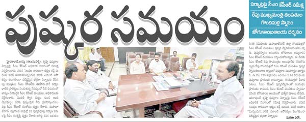 తెలంగాణ రాష్ట్రంలో పుష్కరాల ముహూర్తం ఖరారైంది. ఈ నెల 12న శుక్రవారం ఉదయం 5.58 నిమిషాలకు పుష్కరాలు ప్రారంభం కానున్నాయి. గొందిమళ్లలో పీఠాధిపతులు, సీఎం కేసీఆర్ పుష్కరస్నానాలతో సంరంభం ప్రారంభం కానుంది. సిఎం కెసిఆర్ దంపతులు స్నానమాచరించి జోగులాంబ ఆలయంలో ప్రత్యేక పూజలు చేస్తారు. ఇదిలావుంటే కృష్ణా పుష్కరాల ఏర్పాట్లపై సీఎం కేసీఆర్ అధికారిక నివాసంలో సవిూక్ష నిర్వహించారు. వరుస సెలవుల కారణంగా భక్తుల రద్దీ మరింత పెరిగే అవకాశమున్నందున..వారికి ఎలాంటి అసౌకర్యం కలుగకుండా పటిష్టమైన భద్రతా ఏర్పాట్లను చేసినట్లు మంత్రులు సీఎం కేసీఆర్కు తెలిపారు. భారీ వర్షాల ధాటికి ప్రాజెక్టులు నిండుతున్న నేపథ్యంలో నీటి విడుదలలో జాప్యం చేయొద్దని సీఎం కేసీఆర్ మంత్రులు, అధికారులకు నిర్దేశించారు. మొదటి స్నాన ఘట్టం నుంచి ఆఖరి స్నానఘట్టం వరకు పుష్కలమైన నీరు ప్రవహిస్తుండటం పట్ల సీఎం కేసీఆర్ సంతోషం వ్యక్తం చేశారు. మహబూబ్నగర్, నల్లగొండ జిల్లాల్లో 81 పుష్కరఘాట్ల నిర్మాణ పనులపై సీఎం సంతృప్తి వ్యక్తం చేశారు.