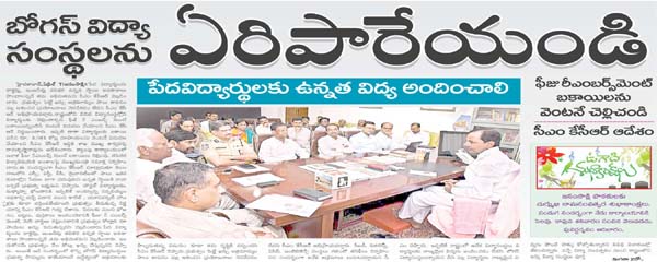 హైదరాబాద్,ఏప్రిల్ 7(జనంసాక్షి):పేద విద్యార్థులను డాక్టర్లు, ఇంజనీర్లు తదితర ఉన్నత స్థాయి అవకాశాలు పొందాలన్నదే తమ అభిమతమని సీఎం కేసీఆర్ వెల్లడించారు. ప్రభుత్వం పెట్టే ఖర్చు అక్రమార్కుల పాలు కావడం వల్ల ఆశించిన ప్రయోజనాలు నెరవేరడం లేదని సీఎం కేసీఆర్ అభిప్రాయపడ్డారు.రాష్ట్రంలోని వివిధ విద్యాసంస్థల్లోని విద్యార్థులకు చెల్లించాల్సిన ఫీజ్ రీ ఎంబర్స్ మెంట్ బకాయిలన్నింటినీ వెంటనే విడుదల చేయాలని సీఎం కేసీఆర్ నిర్ణయించారు. ఇప్పటి దాకా విద్యార్థులకు బకాయి పడిన రూ. 3,061 కోట్ల రూపాయలను వెంటనే విడుదల చేయాలని సీఎం కేసీఆర్ ఆర్ధిక శాఖ ముఖ్య కార్యదర్శి రామకృష్ణారావును ఆదేశించారు. క్యాంపు కార్యాలయంలో ఇవాళ ఫీజు రీ ఎంబర్స్ మెంట్ బకాయిలు చెల్లింపు, తదితర విద్యావిషయక అంశాలపై ముఖ్యమంత్రి సవిూక్ష నిర్వహించారు.ఈ సందర్భంగా సీఎం కేసీఆర్ మాట్లాడుతూ తెలంగాణలోని ఎస్సీ, ఎస్టీ, బీసీ, మైనారిటీలతో పాటు ఇతర కులాల్లోని పేదలు బాగా చదువుకుని ఉన్నత స్థాయికి రావాలన్నదే ప్రభుత్వ లక్ష్యమని చెప్పారు. హాస్టల్ విద్యార్థులకు, మధ్యాహ్న భోజనానికి ఇప్పటికే అందిస్తున్న సన్నబియ్యం పథకాన్ని వచ్చే ఏడాది నుంచి కాలేజ్ , యూనివర్సిటీ హాస్టళ్లకు కూడా వర్తింపజేయాలని ప్రభుత్వం తీసుకున్న నిర్ణయాన్ని సీఎం కేసీఆర్ గుర్తు చేశారు. పేదలకు మంచి భోజనం, బట్టలు, పుస్తకాలు అందించడానికి ఫీజు రీ ఎంబర్స్ మెంట్, మెస్ చార్జీలు చెల్లించడానికి ప్రభుత్వం కోట్లాది రూపాయలు ఖర్చు పెడుతున్నదని వెల్లడించారు.పేద విద్యార్థులను డాక్టర్లు, ఇంజనీర్లు తదితర ఉన్నత స్థాయి అవకాశాలు పొందాలన్నదే తమ అభిమతమని వెల్లడించారు. ఇందుకోసమే ప్రభుత్వం వేల కోట్లు ఖర్చు చేస్తున్నదని చెప్పారు. అయితే ఇదే సందర్భంలో కొన్ని బోగస్ విద్యాసంస్థలు ప్రభుత్వ సొమ్మును కాజేయాలనే ఉద్దేశ్యంతో అక్రమాలకు పాల్పడుతున్న విషయం కూడా తమ దృష్టికి వచ్చిందని సీఎం కేసీఆర్ చెప్పారు.ప్రభుత్వం పెట్టే ఖర్చు అక్రమార్కుల పాలు కావడం వల్ల ఆశించిన ప్రయోజనాలు నెరవేరడం లేదని సీఎం కేసీఆర్ అభిప్రాయపడ్డారు. సీఐడీ, విజిలెన్స్, ఏసీబీ, ఇంటెలిజెన్స్ సంస్థలు గతంలో తనిఖీలు నిర్వహించిన సందర్భంగా అనేక అక్రమాలు బయటపడ్డాయని సీఎం చెప్పారు. ఇప్పటికే రాష్ట్రంలో అనేక విద్యాసంస్థలు విద్యార్థులకు నాణ్యమైన విద్యను అందించడం లేదని, బోగస్ విద్యాసంస్థలున్నాయని దీని వల్ల విద్యార్థులు నాణ్యమైన విద్యను పొందే హక్కు కోల్పోతున్నారని వివిధ విచారణల్లో తేలిందన్నారు. వచ్చే విద్యా సంవత్సరం నుంచి రాష్ట్రంలోని అన్ని విద్యా సంస్థలు పూర్తి స్థాయి ప్రమాణాలతో విద్యను అందించడం కోసం ప్రభుత్వం గట్టి చర్యలు తీసుకుంటుందని వెల్లడించారు.విజిలెన్