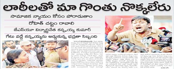 లాఠీలు, తూటాలతో తమ పోరాటాన్ని ఆపలేరని,..అంబేద్కర్, భగత్సింగ్ ఆశయసాధనకు పోరాడుతామని కన్హయ్య స్పష్టం చేశారు. వీసీని తొలగించి… రోహిత్ చట్టం తెచ్చే వరకు పోరాటం సాగుతుందని స్పష్టం చేశారు. కన్హయ్యను వర్శిటీలోపలికి అనుమతించకపోవడంపై సీపీఐ జాతీయ నేత నారాయణ మండిపడ్డారు. ప్రభుత్వం కుట్రపూరితంగా వ్యవహరిస్తుందన్నారు. అయితే వర్శిటీ లోపలికి వెళ్లేందుకు కన్హయ్య ఎంత ప్రయత్నించినప్పటికీ సెక్యూరిటీ సిబ్బంది అడ్డుచెప్పడంతో చివరకు కన్హయ్య వెనక్కి వెళ్లిపోయారు. అనంతరం పోలీసుల లాఠీచార్జ్ లో గాయపడి మధినాగూడలోని ప్రణవ్ ఆసుపత్రిలో చికిత్స పొందుతున్న విద్యార్ధి ఉదయ్ను పరామర్శించారు.