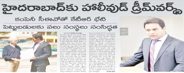 చేతనైనంత సహాయం చేస్తామని హామి ఇచ్చారు. డ్రీమ్ వర్క్స్ విస్తరణకు అంతర్జాతీయ స్థాయిలో త్వరలో హైదరాబాద్ లో నిర్మించే ఫిల్మ్ సిటీ అత్యంత అనుకూలంగా ఉంటుందన్నారు కేటీఆర్. ఇక పర్యాటకులను ఆకర్షించేందుకు హైదరాబాద్ లో చిన్నతరహా థీమ్ సెంటర్, డ్రీమ్ ప్లేను ఏర్పాటు చేయాలని రాష్ట్ర ప్రభుత్వం, డ్రీమ్ వర్క్స్ ఈ సమావేశంలో నిర్ణయించాయి. హైదరాబాద్ వచ్చి భారత మార్కెట్అవసరాలు, స్థానిక నైపుణ్యాన్ని పరిశీలించాలని జెఫ్రీని మంత్రి కేటీఆర్ కోరారు. ఆ తర్వాత లాస్ ఏంజెల్స్ ఇన్నోవేషన్ సెంటర్ క్లీన్ టెక్ ఇంక్యుబేటర్ ను తారకరామారావు సందర్శించారు. నీటి సంరక్షణతో పాటుమురుగునీటి శుద్దిలో వినూత్నమైన పద్దతులను అవలంబిస్తున్న క్లీన్ టెక్ పనితీరు, విజయవంతమైన తీరును కేటీఆర్ తెలుసుకున్నారు. హైదరాబాద్ లో ఏర్పాటుచేసిన టీ హబ్ గురించి వివరించి తగిన సహకారం అందించాలని, కలిసి పనిచేయాలని కోరారు. ఇంక్యుబేటర్ సీఈఓను హైదరాబాద్ రావాలని మంత్రి ఆహ్వానించారు.