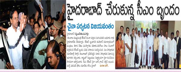తెలంగాణ ముఖ్యమంత్రి కేసీఆర్ చెయనా పర్యటన ముగించుకుని బుధవారం రాత్రి హైదరాబాద్కు చేరుకున్నారు. కేసీఆర్ బృందానికి శంషాబాద్ విమానాశ్రయంలో మంత్రులు, తెరాస నేతలు ఘనస్వాగతం పలికారు.పదిరోజుల పాటు చెయనాలో పర్యటించిన కేసీఆర్ బృందం వివిధ నగరాలను సందర్శించింది. పలు పారిశ్రామిక సమావేశాల్లో పాల్గొని తెలంగాణలో ప్రవేశపెట్టిన నూతన పారిశ్రామిక విధానంపై అవగాహన కల్పించారు. రాష్ట్రంలో పెట్టుబడులు పెట్టాల్సిందిగా చైనా కంపెనీలను సాదరంగా ఆహ్వానించారు.