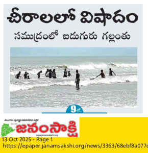 ` సముద్రంలో ఐదుగురు గల్లంతు చీరాల(జనంసాక్షి):బాపట్ల జిల్లా చీరాల మండలం వాడరేవు తీరంలో విషాదం నెలకొంది. సముద్రంలో స్నానానికి దిగిన ఐదుగురు అలల తాకిడికి గల్లంతయ్యారు. వారిలో …